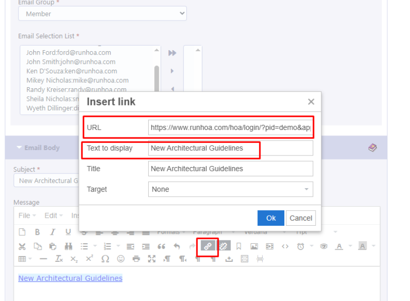 - Message: This is where you compose the body of your email. Use the rich text editor to format your text, add images, links, and other formatting to make your email clear and engaging.Start your message with a greeting such as “Dear Demo Valley HOA Member,” to personalize the email.